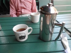 The Whistling Kettle – 138 Jay Street, Schenectady. Yang discovered this tea room for replenishment after our bicycle ride along the Mohawk River. It’s located on a lovely street, dedicated pedestrian, of cafes and shops. The Whistling Kettle is a delight. Inside, the decor is somewhat moderne, with a healthy array of teas and tea paraphernalia for sale. We sat outside, with a nifty view of the street and passersby. The menus for tea and comestibles are extensive. From their menu of 120 teas, I chose Ancient Forest, a strong but not overwhelming black tea with hints of Keemun. This tea is no longer listed on the menu, but you can request it from the server, as you can the equally delectable cherry/fig. Better yet, you can also buy the loose leaf tea to take home with you in sample or four oz. packages. Yang gave the thumbs up to their green Sencha. The food was delicious! I had the Farmer’s Crêpe with spinach, bacon, basil pesto, tomato, artichoke heart, and fresh mozzarella. Filling and yummy. Yang enjoyed the Monte Cristo Crêpe. We both elected salads instead of chips as our side, and were not disappointed by the fresh veggies and tasty dressing. The food menu is extensive, with sweet and savory crêpes, sandwiches, salads, soups, and brunch, breakfast, and afternoon teas. The scone-wiches are also delectable. My favorite is the ham, cheese, and apricot on a savory scone. Those teas give you a healthy selection of choices for the various courses. Maybe on one of our autumn rides, we’ll stop here and indulge ourselves in an afternoon tea!