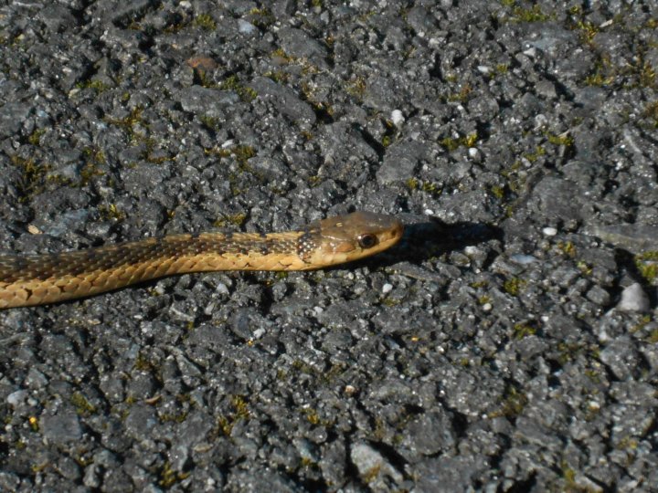 I almost ran over a little one of these guys when he was trying to cross the trail. I guess he wanted to get to the other side. Playing chicken? He was too small for me to see right away, but Yang assured me he was okay. Then, I came across his big sister right here. A beauty, eh? I don’t know what kind this one is. His/her color is coppery with darker markings, so it doesn’t look like a garter snake to me. What do you think? Can anyone answer my query?