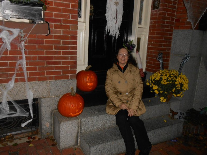People giving out candy also get into the “spirit,” with elaborate costumes.  You see witches, mad scientists, zombies.  One year, a woman was Cruella Deville.BeaconHill14I love this woman’s Snow Queen or Fairy Queen ensemble – complete with a matching (real live!) poodle on her lap! She was kind enough to let us take her picture – and her dog agreed, too.
