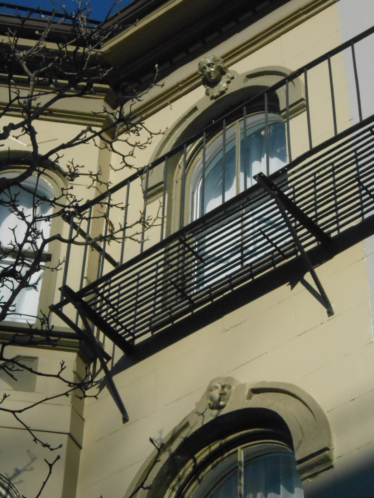 They weren’t Brownstones but brick and wood.  Lovely, at least on the outside, rows of attached buildings.  We were particularly taken by the carved heads that adorned the outside walls.  Several of the house on the opposite side of the street had a woman’s head over the lintel.  Well, not an ACTUAL woman’s head.  Only a carved one.  These houses, on our side of the street had the carved heads of an Elizabethan, even Shakespearean guy and an eighteenth-century head.  Voltaire?