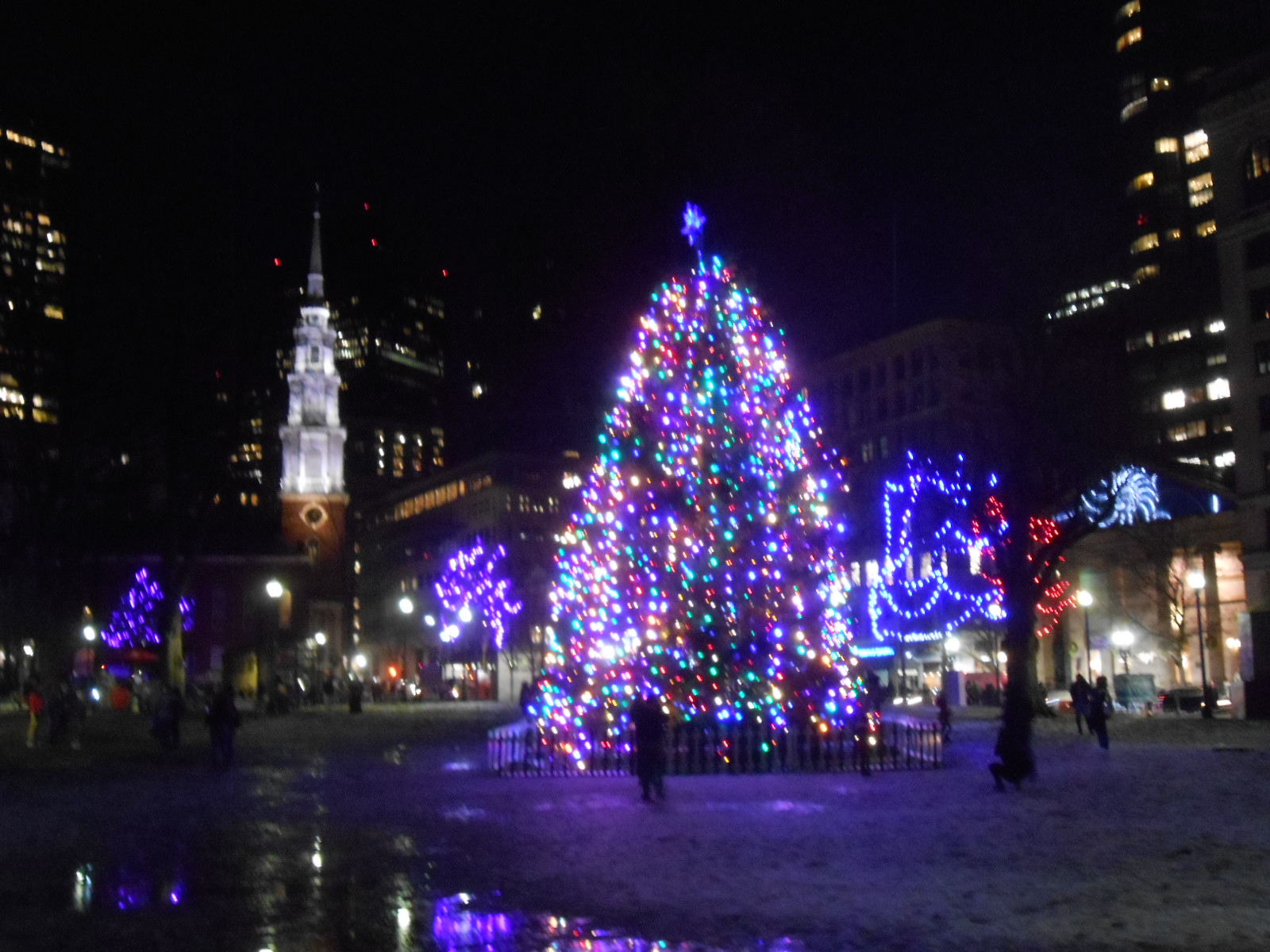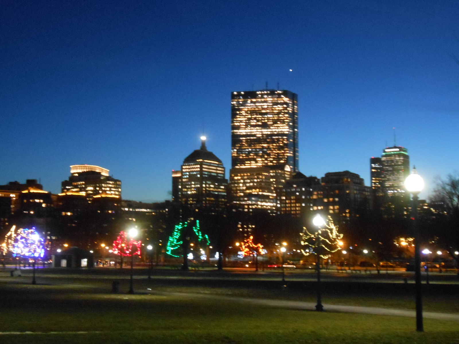 Lastly, as the sun had just set, we crossed the Boston Common to get to the Downtown Crossing and take a subway back to our car.  Yang took some wonderful pictures of the skyscrapers and Christmas lights in the trees glowing against the falling night and the fading sun.