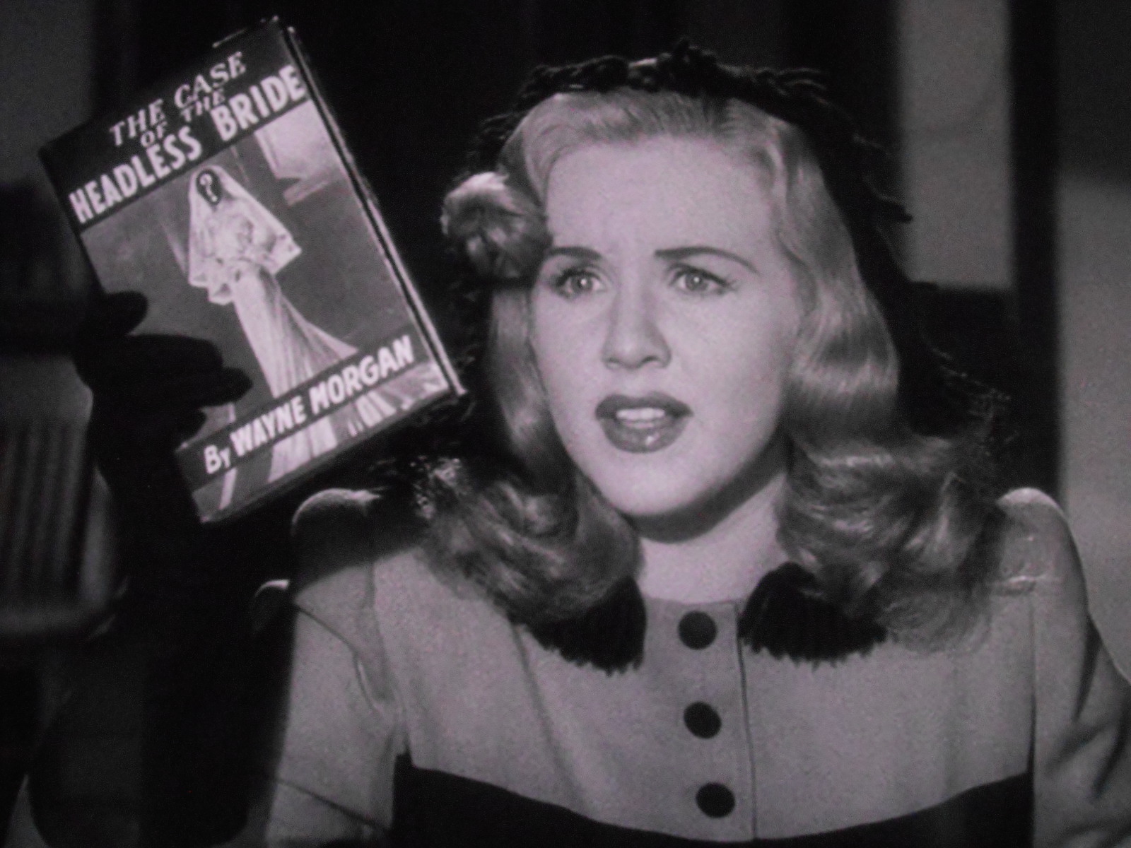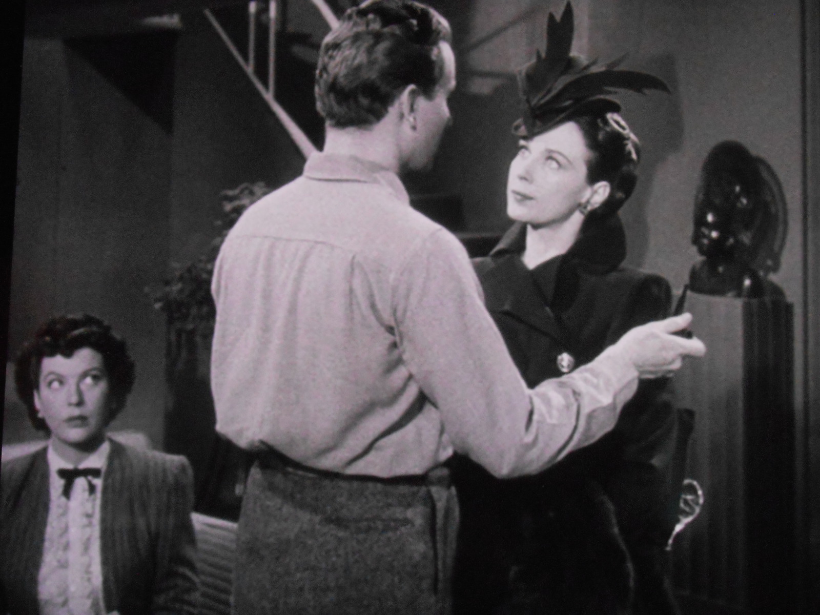 So, what is our undaunted heroine’s next step? Why, track down that mystery author, Wayne Morgan, to help her solve the crime.  Played by David Bruce, the author does not appreciate her throwing this strange tale in his lap and expecting him to solve the murder – especially since she hounds him by interrupting his meeting with his fiancee and then tracking the writer and fiancee to a movie theatre – where Nicki sees in the newsreel that the famous wealthy man recently found dead from “falling while decorating his tree” is the same guy she saw murdered!  Our poor author ends up really up against it while trying to fend off Nicki’s insistence he help her while he is under the gimlet eyes of a formidable fiancee ( the elegant but indomitable Patricia Morison) and a secretary (Jacqueline DeWitt), whose dry cracks and skepticism over the writer’s capabilities would do Eve Arden proud.