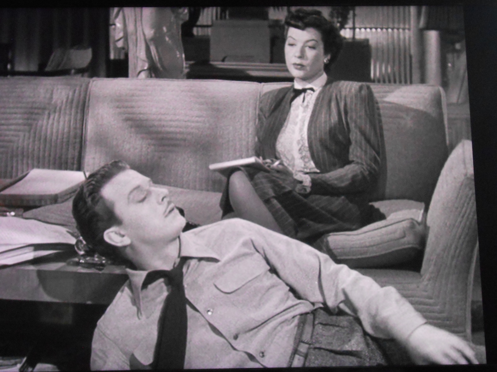 Top Secret Affair comes later, in 1957, and there is some talk from Hayward’s Dottie Peele about always wanting to meet a guy she could respect, marry, and have a family with.  Still, the only guy who can go toe to toe with her is Kirk Douglas’s general.  As the top of a media conglomerate that drives public opinion, but mostly for the better (no female Rupert Murdoch, she!), Susan gives us a smart, strong, articulate woman.  A newsreel featuring the general leaves her unimpressed with military propaganda, as she dismisses him with, “Look at him apple polishing the President (FDR).  I bet he voted for Wilkie.” Or “Bang, bang.  Like a kid with a space gun.”  The oversized image of his face doesn’t cowe her as the army might intend, as she instead dismisses him with, “Get back in your tank, turtlehead.”  The director gives us an intriguing cut to emphasize that Dottie Peele is no weak woman to be cowed by military might.  Right after General Goodwin tells his adjutant, “There’s only two kinds of women in this world: mothers and the other kind,” we cut to Dottie saying, “There’s only two kinds of men in this world – and I can handle both of them.”  Of course, the two end up together, but not before they have to plow through misunderstandings and reconciliations, the latter from mutual respect rather than deceit or submission.  Some remarks from Dottie let us know that even if she retires from media in marriage, she’ll not retire from speaking her mind and maybe a plunge into politics, though perhaps indirectly.