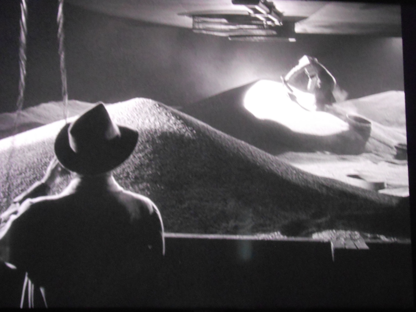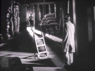 One particular sequence squarely fits the noir motif when Durbin inadvertently lets slip as she rides a car up an elevator in an urban garage a clue she may be wise to the killer – who likely is her companion, the murdered man’s nephew Dan Duryea (a noir stalwart if there ever was one).  What follows is a pursuit through chiaroscuro shadows and interconnected rooms, people framed or trapped in doorways, people being pursued or unknowingly spied upon, even through the dunes of sand waiting to be used against the snow outside.  Another scene finds the other nephew, played by Ralph Bellamy, addressing her with a creepy smile and revealing that  that old stiff Aunt Sarah used to visit him at night and . . . we never find out what?! Brrrrr!!!!!