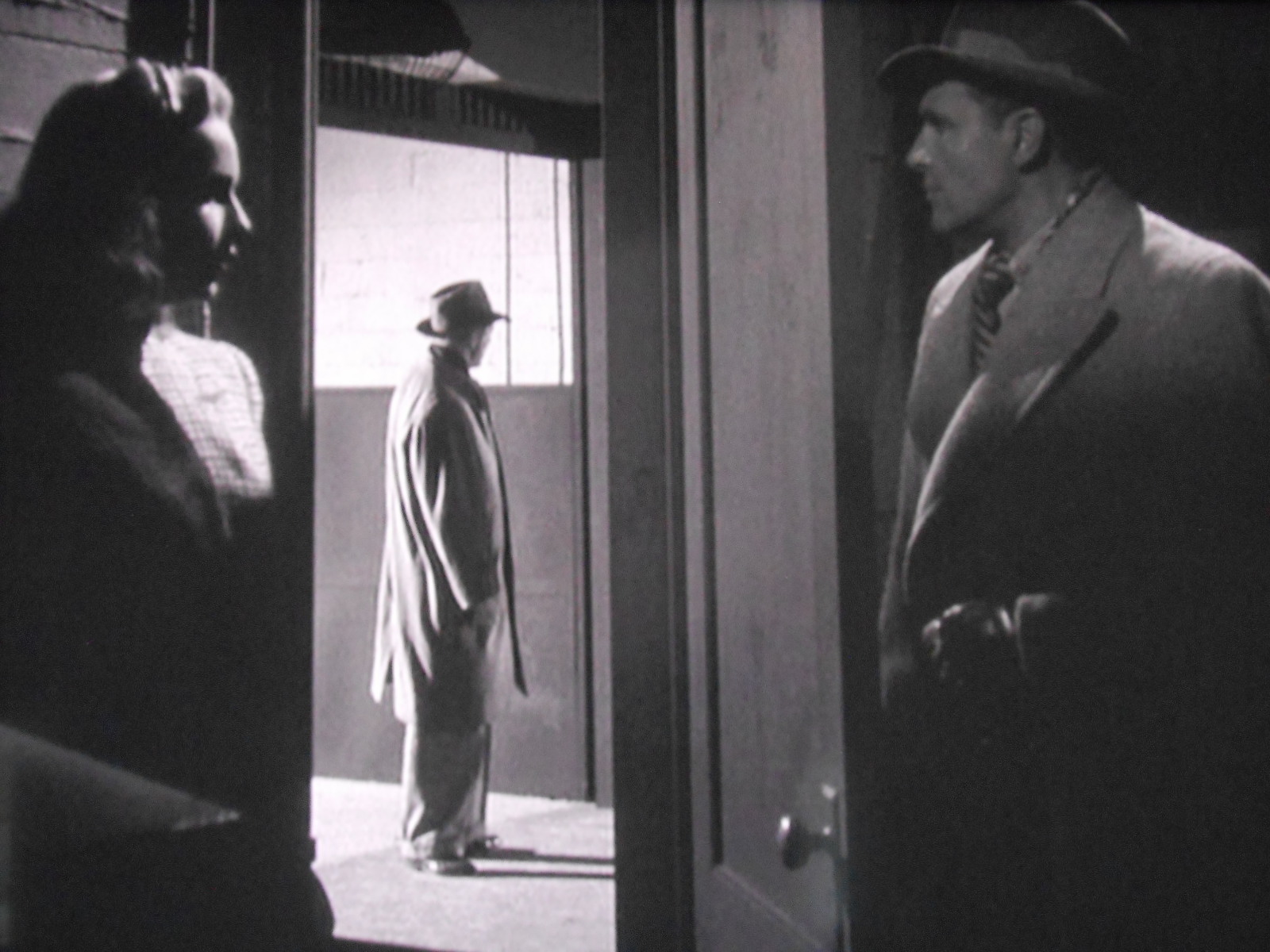 Dennis O’Keefe’s place in the noir universe as hard-bitten outsider trying to belong without sacrificing integrity makes him an apt proxy for the audience looking for order and stability in an uncertain and corrupt world. His character’s confrontation with Bendix’s sheriff in the shadows of the murder mansion where he’d planned to lure the murderer into a trap creates a disconcerting, even haunting embodiment of the danger of noir uncertainty. All on Christmas Eve. Interestingly, when the sheriff first enters, the visuals throw us off balance by placing Best more in the light and shadowing Sam, the seeker of truth, in a threatening, sneaky pose in the shadows. Which of the two antagonists can we trust?  Is Sam literally and figuratively in the dark? Is he bringing darkness into the Christmas world or revealing what was there all along? This use of shadows enveloping the men as the scene progresses creates a space of confusion and doubt that mirrors the uncertainty of reality as Sam raises suspicions and presses for honest answers, and the sheriff seeks to control that truth for unclear ends, gradually unveiling indirectly what may or not be honest.