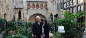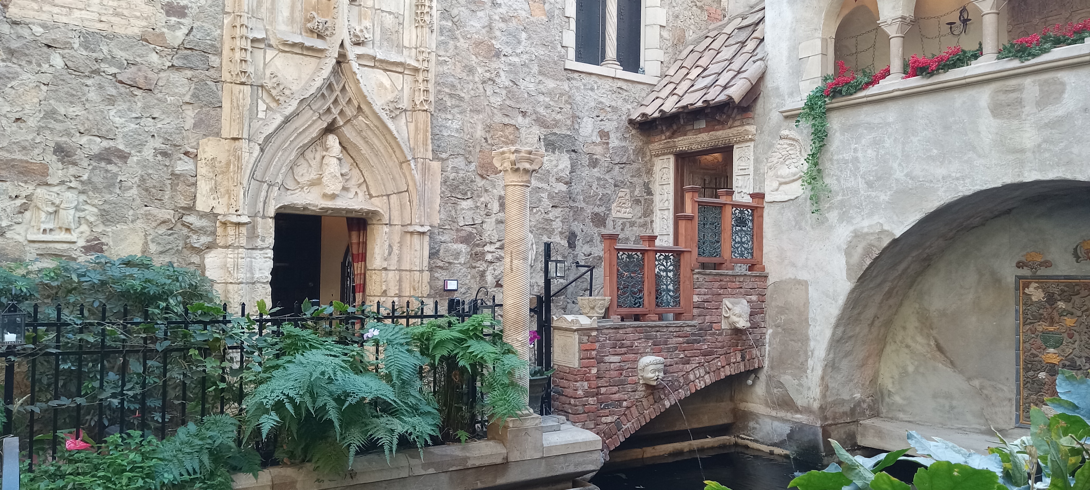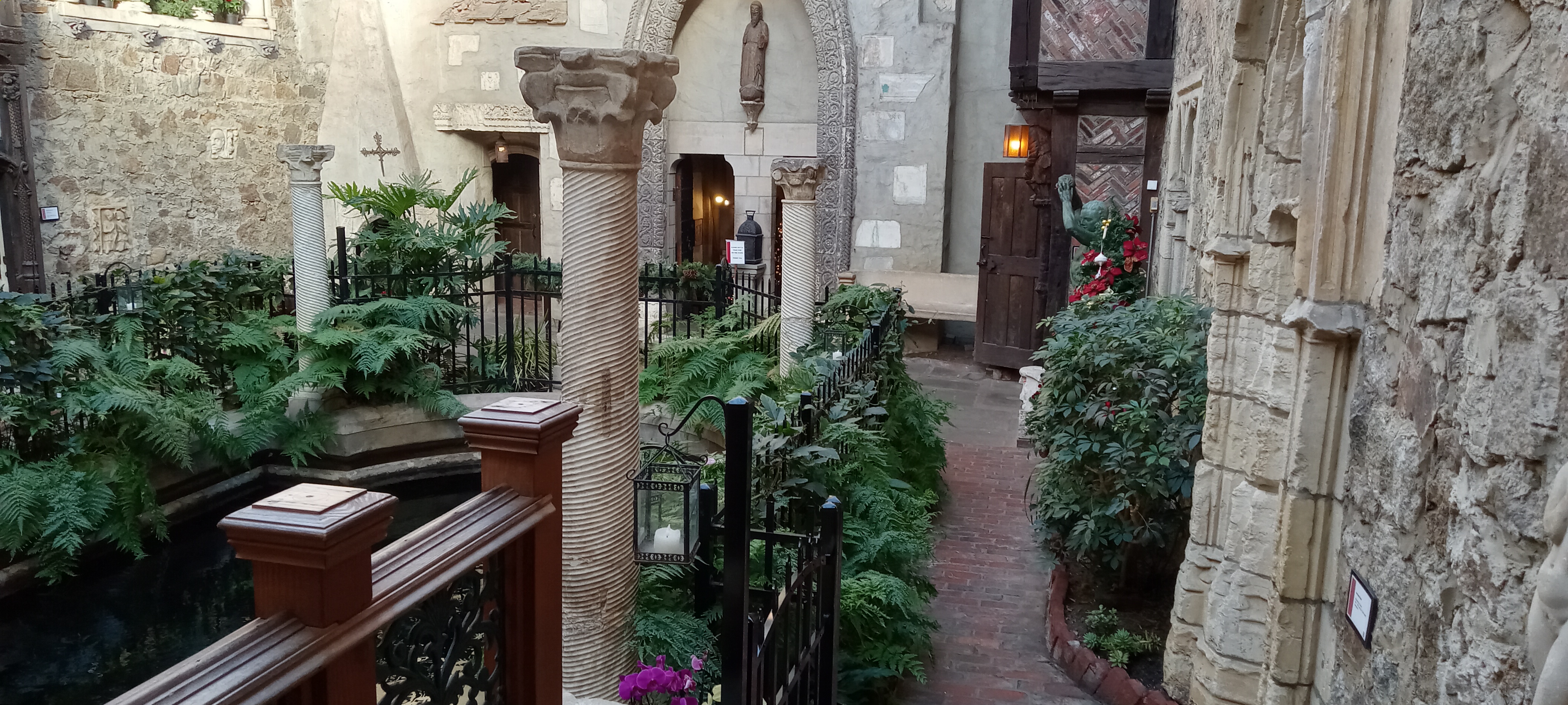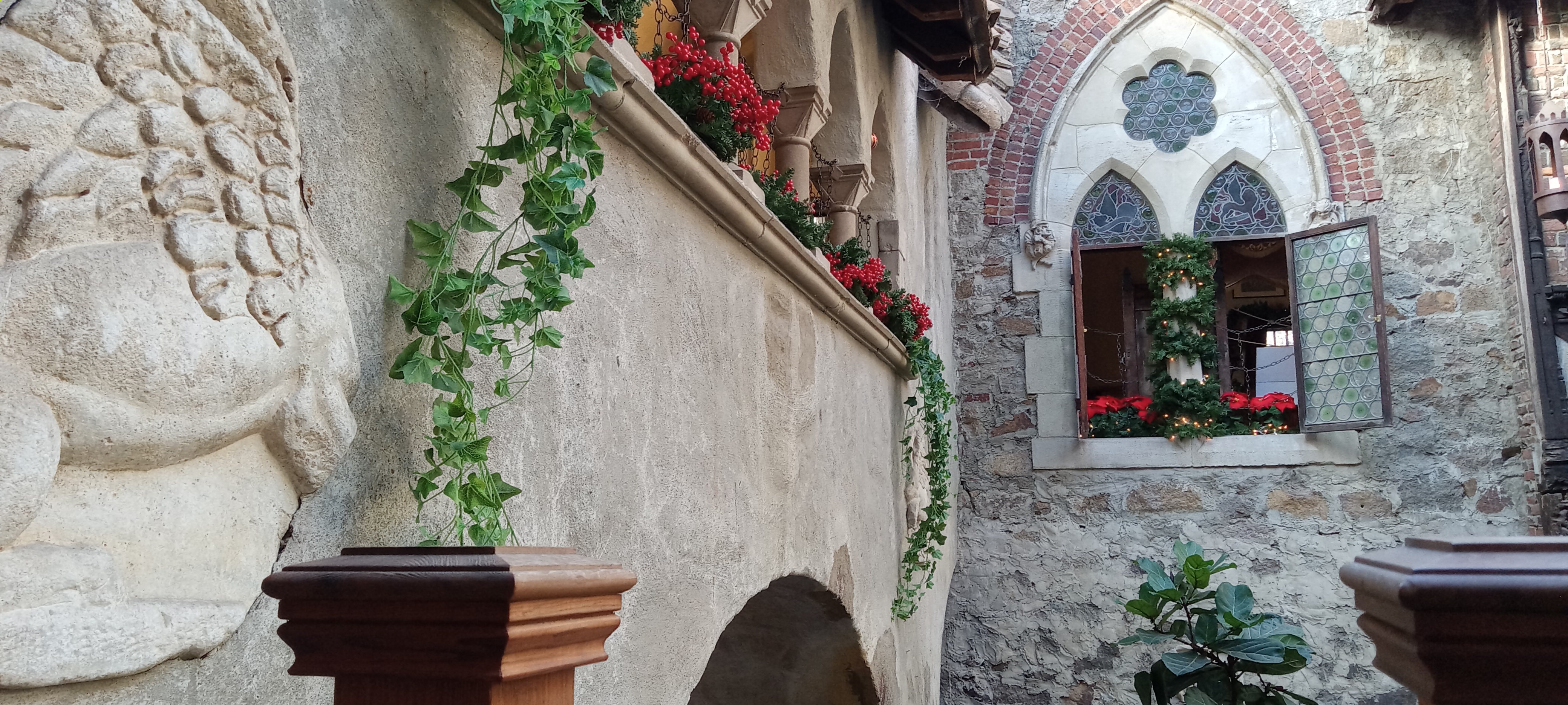 How about this huge hearth? Would it keep the entire hall warm? Well, maybe you ought to remove the Christmas decorations first! The courtyard was a real treat! Recreations or imports of medieval and renaissance shop fronts were integrated into the walls, leading into various rooms. The courtyard was roofed with glass skylighting, allowing for the growing of all kinds of plants that surrounded a long, eight-foot deep We were lucky enough to meet two of the guides there who took our picture. We had a great chat Anyway, here are some more shots of the courtyard.