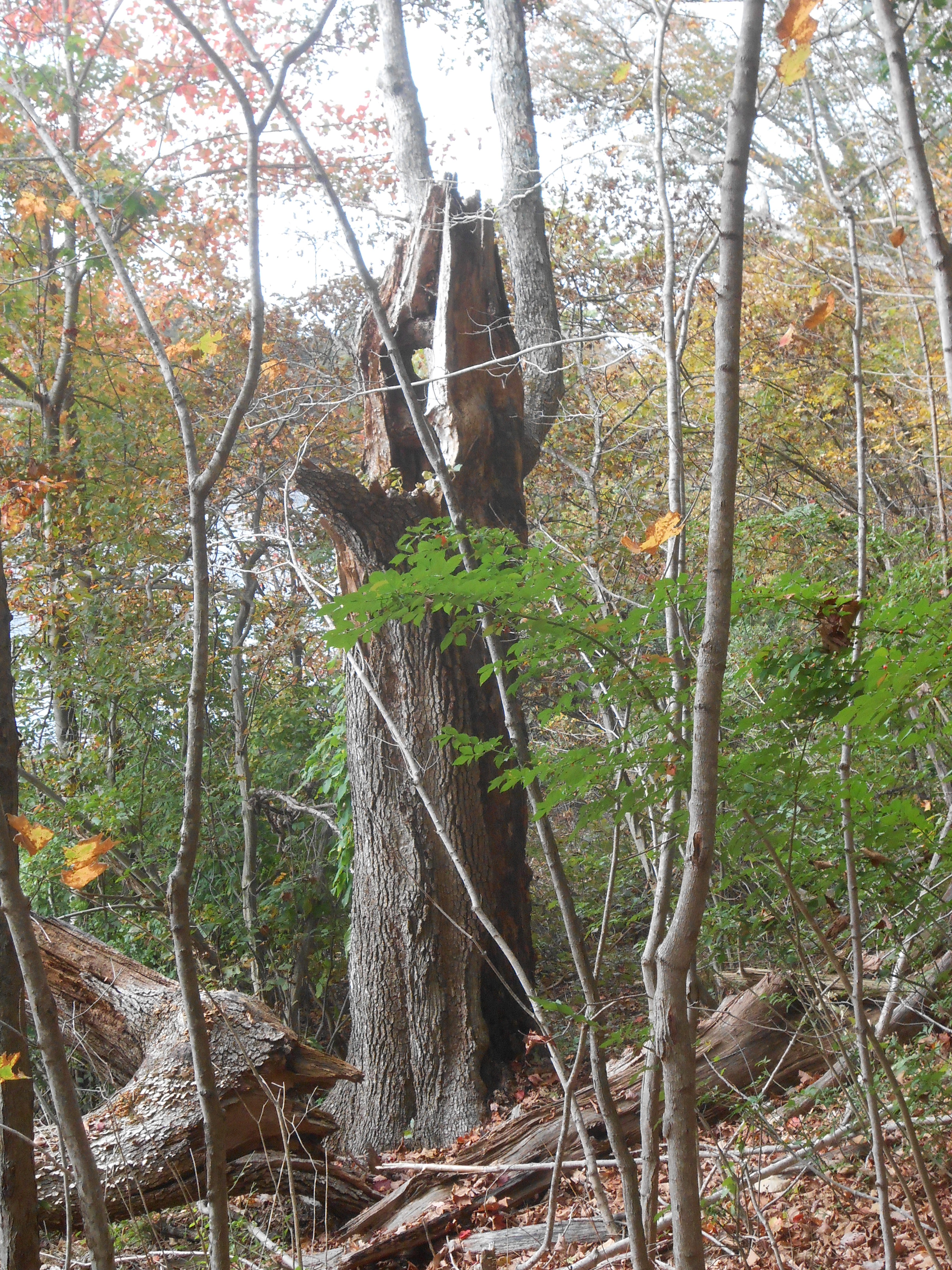 Yang and I were not daunted.  We knew of a dirt trail in the woods that would circle around the flooded road and, with luck, bring us to an unflooded portion of the road by the dam.  En route, we came across this wonderfully haunted looking dead tree.