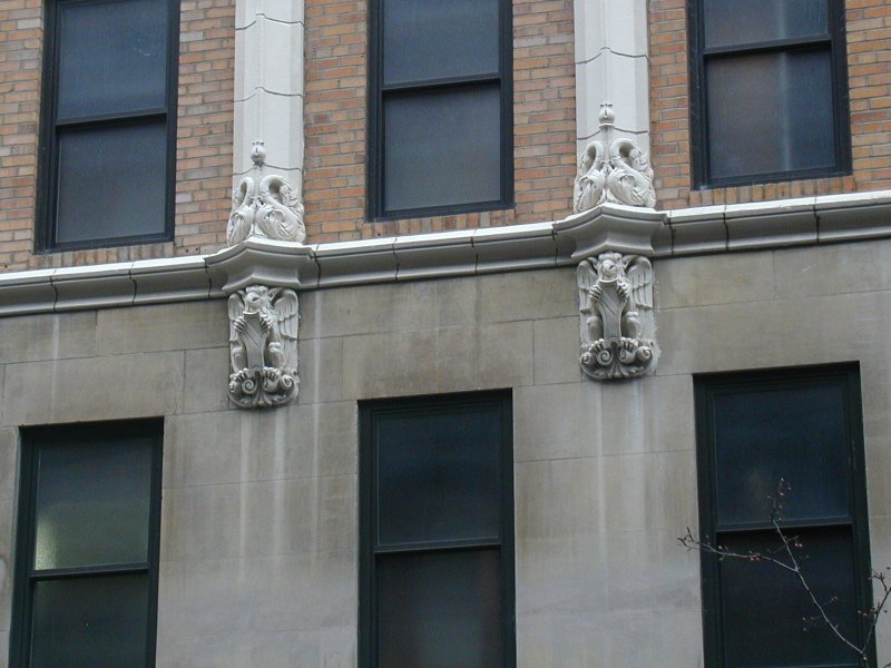 Here, you can see swans above gryphons holding escutcheons, but with no motto or symbol on the shield.  The wider shot below illustrates the art deco design over the entranceway.  Would this building have been constructed in the 1920s or ’30s?