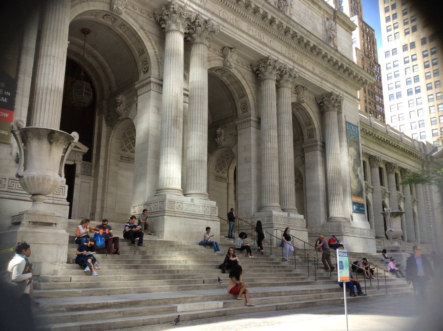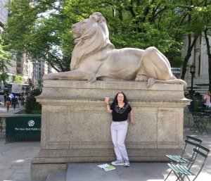 We all started off by chatting about writing, teaching, and the inspirations for my 1940s-style mysteries, especially how I like to cast my characters as  favorite actors from the era: Joan Bennett and Rosalind Russell as the smart-talking Minton sisters, Lloyd Nolan as the tough-guy henchman, and Claire Trevor as the ultimate femme fatale, for example.   Interspersed with these points, I did some readings, which I’m happy to report, people found tense and intriguing.  I gave them a scene where sisters Jessica and Liz have to face off against the threats of the femme fatale’s menacing torpedo – without giving away what mysterious object he held in his hand that would prove a vital pivot for the plot.  I later read from the scene where Jessica had to flee and seek refuge from deadly pursuers behind one of the lions in front of the New York Public Library. This led to a discussion of Dead Man’s cover and the fun story where I went to New York with Yang to “test” out the scene of Jessica’s flight.
