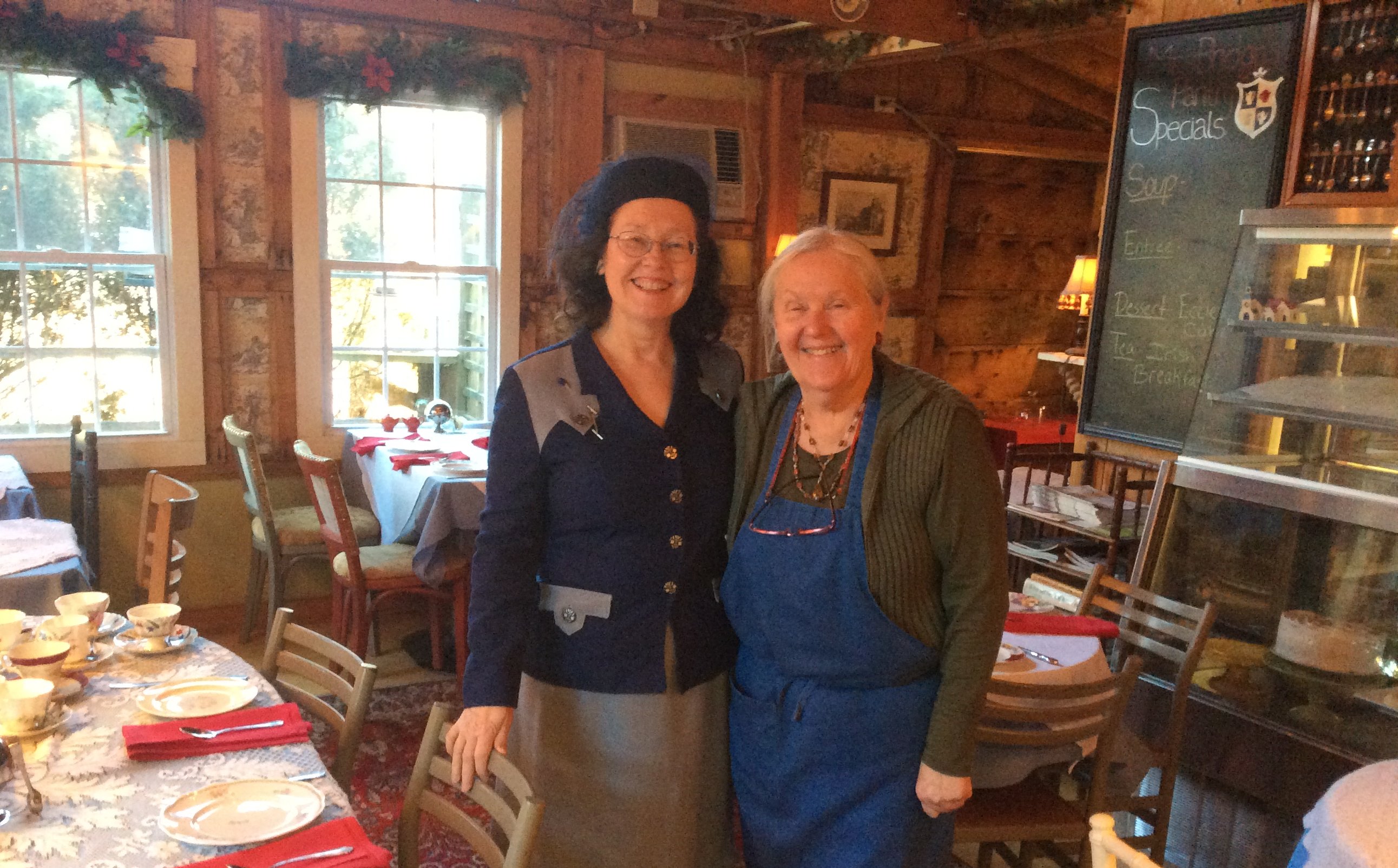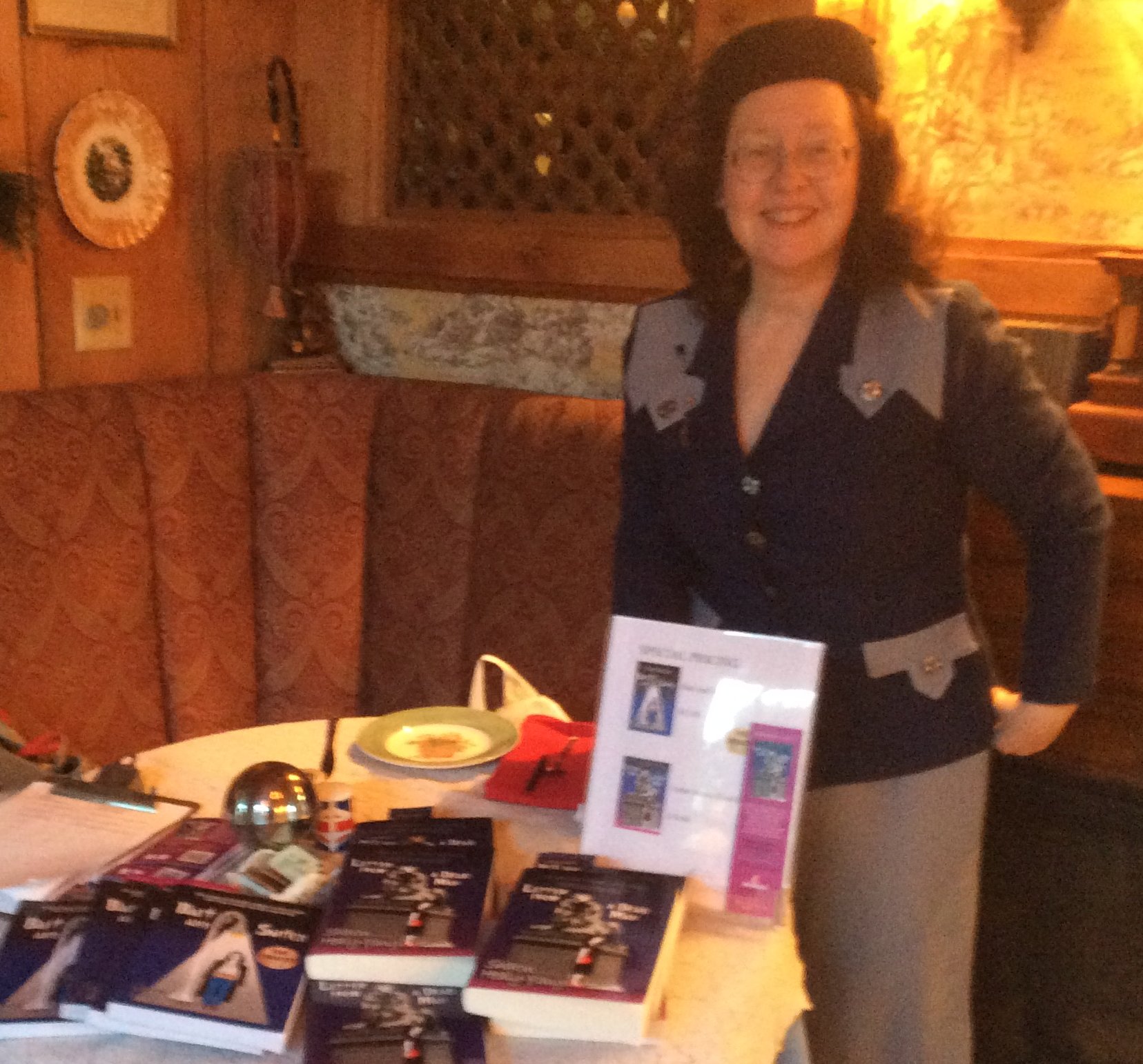 Monday, March 26th, I had the delightful pleasure of being the guest of honor at the Tea and Book Club held every last Monday (fall through spring) at Mrs. Bridges Pantry in Woodstock, Ct.  It’s an exciting experience, where I join the book club for an evening of tasty comestibles and tea, then get to talk to them and answer questions about my writing – as well as sell some books! For good luck, I wore a beautiful navy and grey two-tone suit that Yang made for me, based on a pattern he created from a vintage outfit.  Of course, I couldn’t talk about my smart-talking gal, Jessica Minton, without wearing a pin that had once belonged to one of the original smart-talking gals, Joan Bennett!