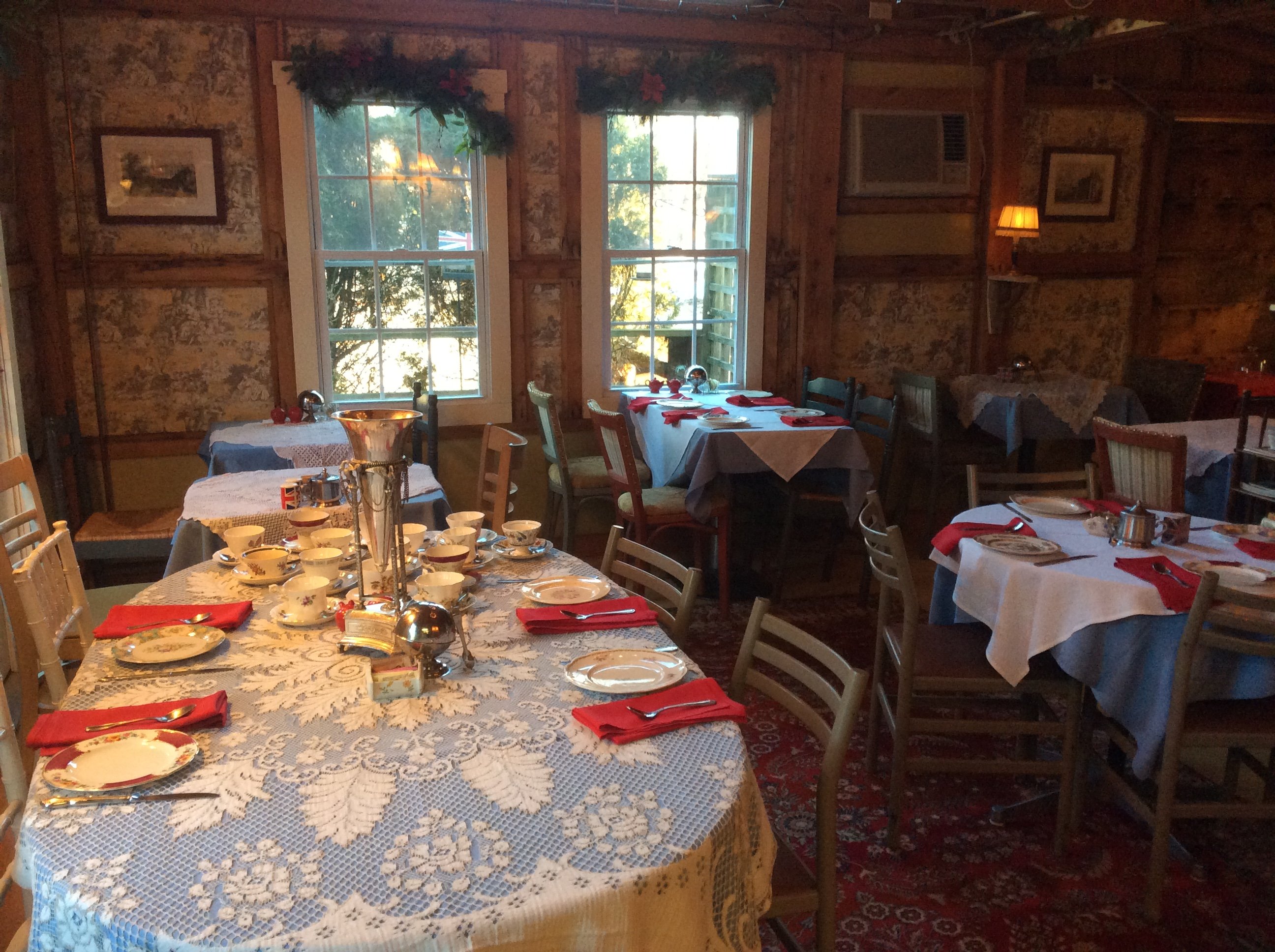 Mrs. Bridges is set in beautiful rural Connecticut, just over the border from Massachusetts.  The tea room is in a rustic wooden building.  Every day of the week but Tuesday, you can journey there for lunch, dessert, and/or afternoon tea.  They have a wide selection of black, green, red, and herbal teas.  In fact, they are a major supplier for me!  I highly recommend you visit, as I and my husband or I and my girlfriends frequently do.  The people there are so friendly and fun, you’ll feel as if you are back with chums in no time.  As you can see in the layout for the evening’s tea, there is a homey, lovely dining room.  Further, you can find on the other side of the building all kinds of teas, china, and tea-related items for sale – including Bait and Switch and Letter from a Dead Man, the perfect accompaniment to a nice cuppa!