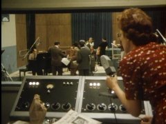 Next comes a switch to the pre-production frenzy of putting on a radio program, following producer/director Paul Stewart into the broadcasting station and up the elevator to the studio with a network standards and practices rep hammering at him to keep things uncontroversial, then into the studio where he’s pulling together script changes and pressing the sound effects woman to create something ominous.  It’s an exciting vision of how live radio performances came together: actors, scripts, sound effects, orchestra, directing battling against time, censors, and technical limitations.  If you think about it, though, all this rush and pressure to make things perfect right up to the last minute also mirrors the sense of tension and uncertainty in the country itself.  A nice hint at the unspoken realization of the tinderbox of American fears is the S & P guy (Tom Bosley) insisting that they can’t have Roosevelt as part of the story; they have to go down all the way down to the Secretary of the Interior.  It’s never uttered, but, of course, having “Roosevelt” in their play about a devastating invasion lends it too much authenticity.  And isn’t it much less scary if you skip past vice presidents, speakers of the house, secretaries of state all the way down to Secretary of the Interior.  (Welles gets past this by agreeing to substitute Secretary of the Interior for the President, but he sounds like Roosevelt). Art liberates attempts to suppresses reality.