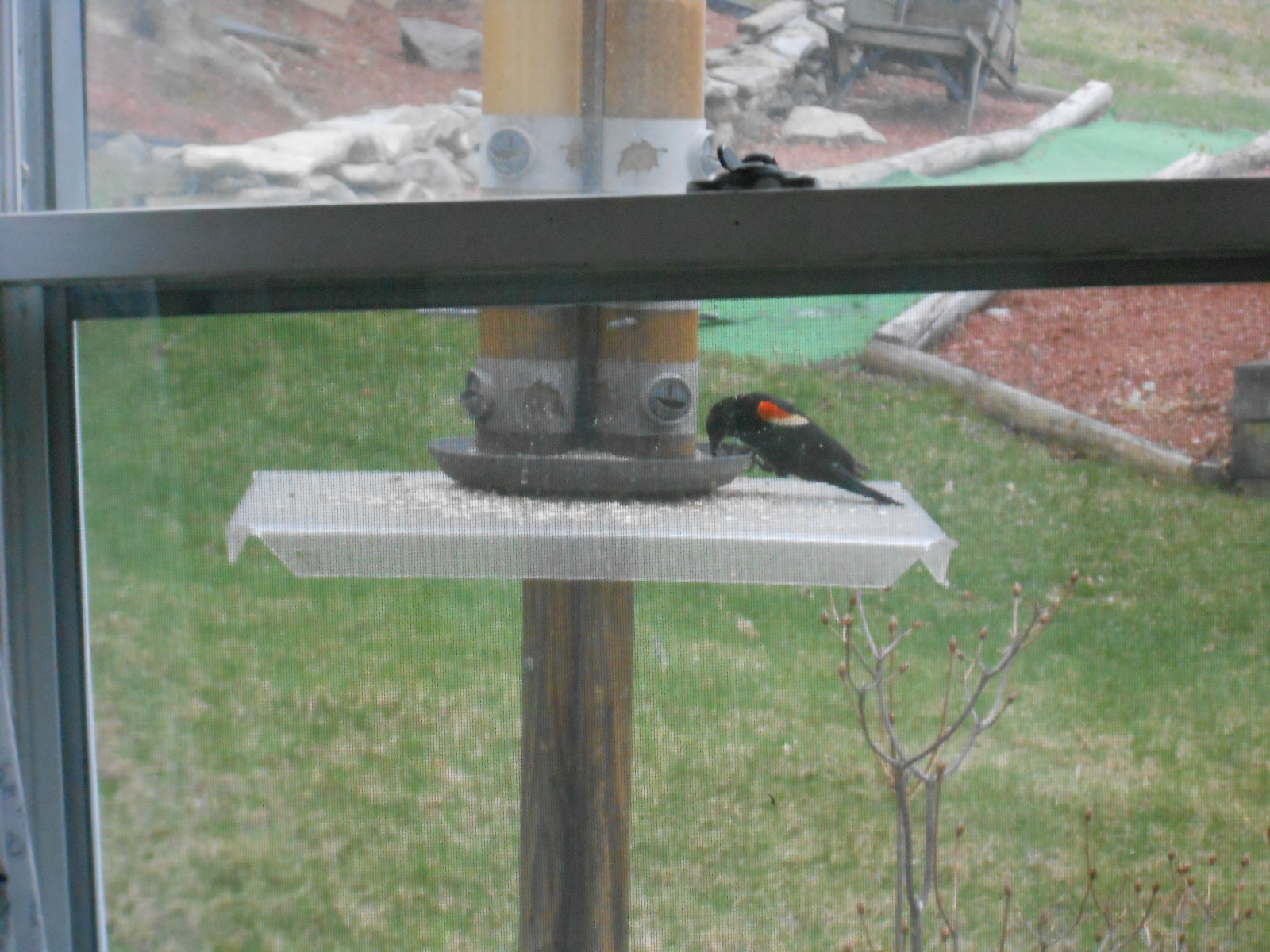The Red-Winged Blackbird whistles his presence then bares the startling orange and yellow of his epaulets. Best of all is our pair of male