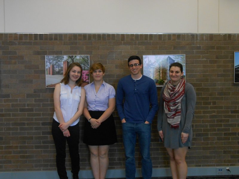 The English Department also racked up points through the Commonwealth Honors Projects,Picture2 with the first two awards going to Amy Angell (on the right) and Kayleigh Berger and Kasey Wazniak (left to right). Amy’s work was The Goodbyemoon—A Memoir of Loss, with Dr. Elizabeth Bidinger as her advisor.  Kasey and Kayleigh’s was Introducing Elizabeth Bishop, Poetry, and Writing as a Process, with Dr. Heather Treseler as their advisor.  Not knowing Amy well (though I’ve heard wonderful things about her!), I can’t speak to her project.  Maybe one of my readers out there who knows the whole story can add a comment to this post!  I do know that Kayleigh and Kasey did extensive, detailed research on Elizabeth Bishop’s background and writing processes, looking over actual records and manuscripts  to create a paper and drawing on that research to create a lesson plan on writing and revision for their own future teaching as well as for other teachers.